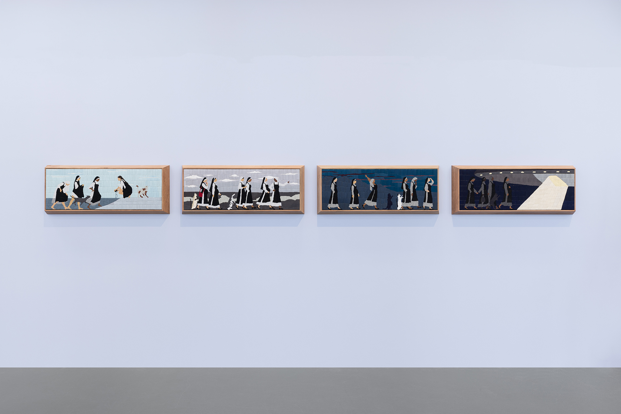Nuns walk at dawn, midday, twilight, and night, needlepoint tapestry series, 2025