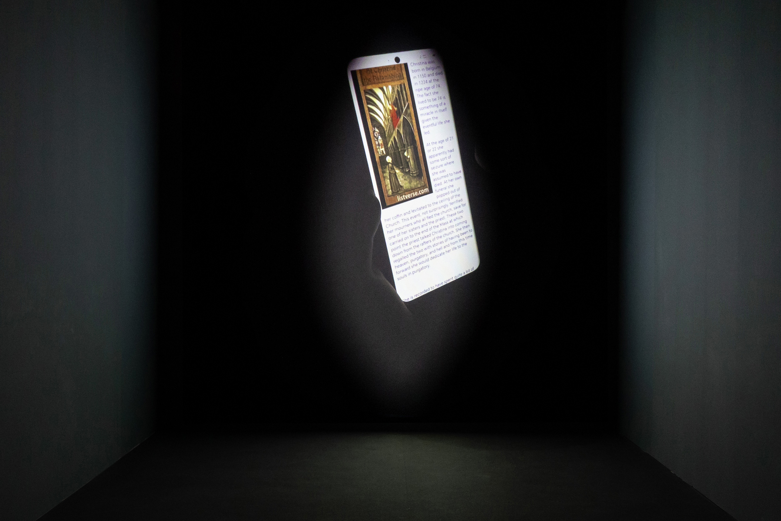 On a stormy night, a woman dreams of a pregnant cat and cannot fall back asleep. Something compels her to read about the biography of Christina the Astonishing, a 13th century saint known for nourishing herself with milk from her own breasts. Throughout the night, as she reads, strange phenomena unfold. Filmed between friends and around my own neighbourhood, the film is framed by a Mandorla "holy almond" which gives it its title. The shape, often used throughout the Middle Ages to encircle images of saints, is an evolution of an earlier icon for the divine, that of a slit, or vulva, from where the world was thought to originate.