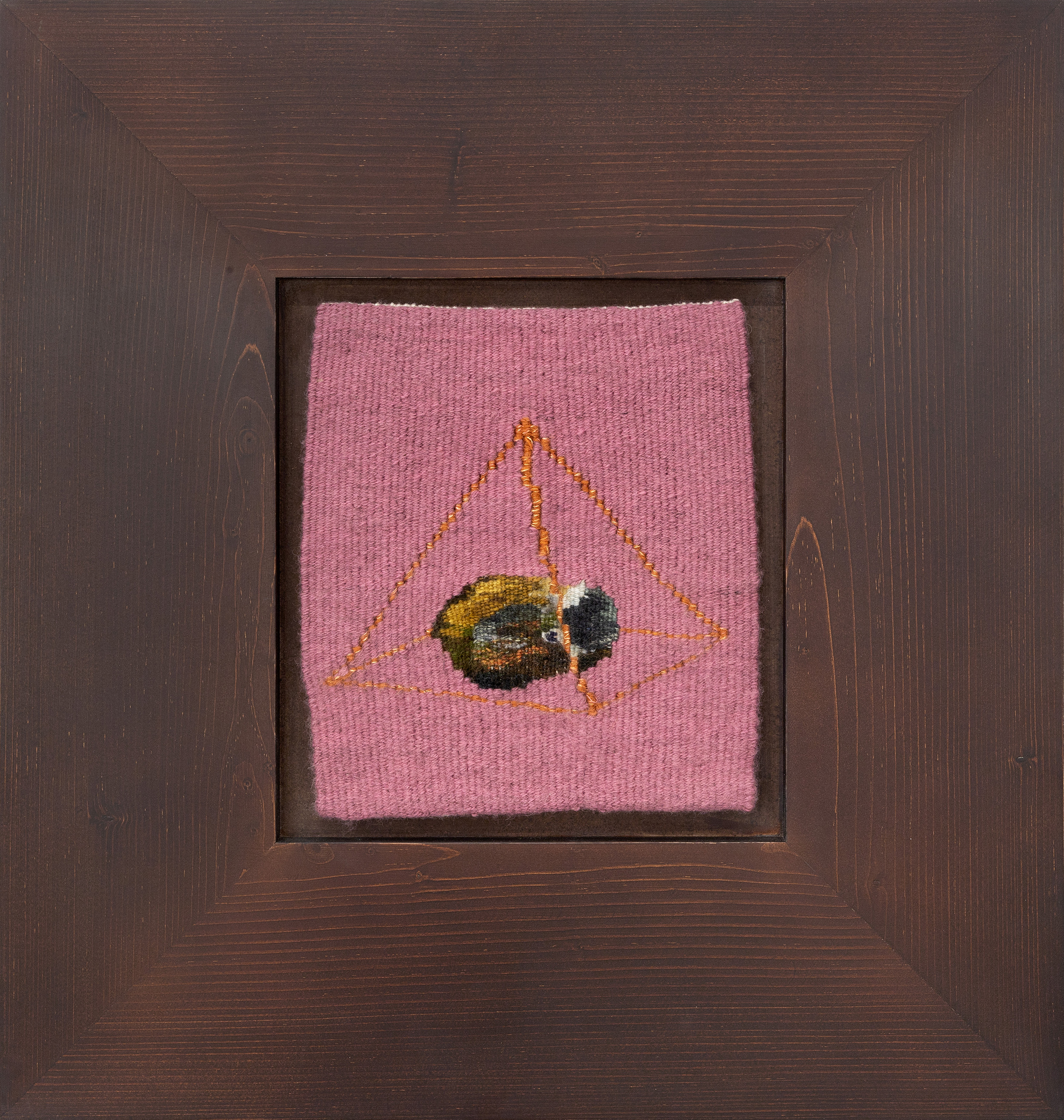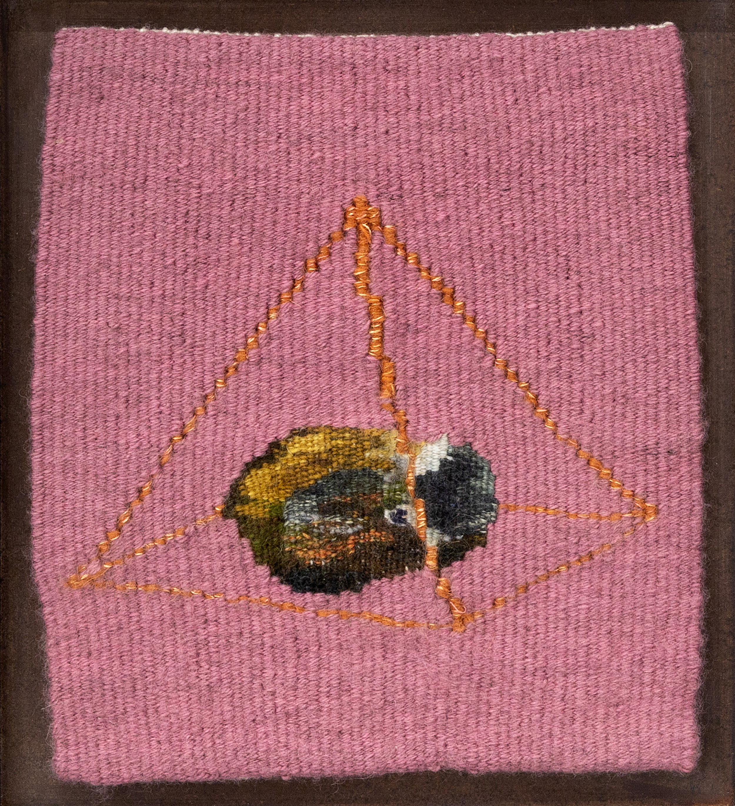 Still Monkey Under Pyramid, 2023 Handwoven tapestry, wool, mahogany frame
